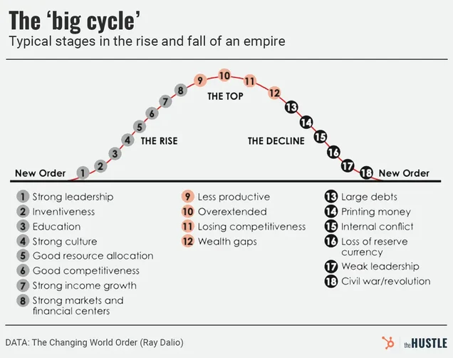 As Ray Dalio's framework describes, we believe the global economy is currently navigating stages 16–17 of the Long-Term Debt Cycle — a juncture characterized by fiscal stress, eroding institutional credibility, and rising geopolitical competition.