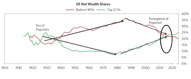 Simultaneously, the labor factor has faced a sustained degradation relative to capital. Wage growth has been structurally capped by WTO-driven globalization (through labor arbitrage via offshoring) and by large-scale immigration flows that have expanded the domestic labor supply since 2022. As a result, wealth concentration has returned to levels not seen since the 1930s — a comparison that should not be taken lightly.