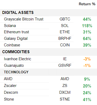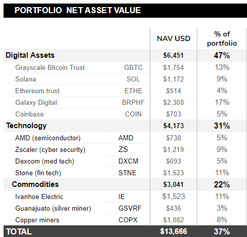 We started the portfolio with $10,000 five weeks ago, and the net asset value is up 37%. There has been one new entry in the portfolio: Copper Miners ETF. The portfolio is fully allocated by now.