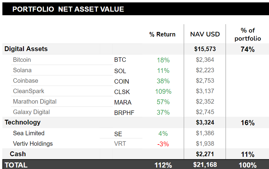 We started the portfolio with $10,000 on October 20th 2023, and we already more than doubled our investment capital since. We are up 112%.
