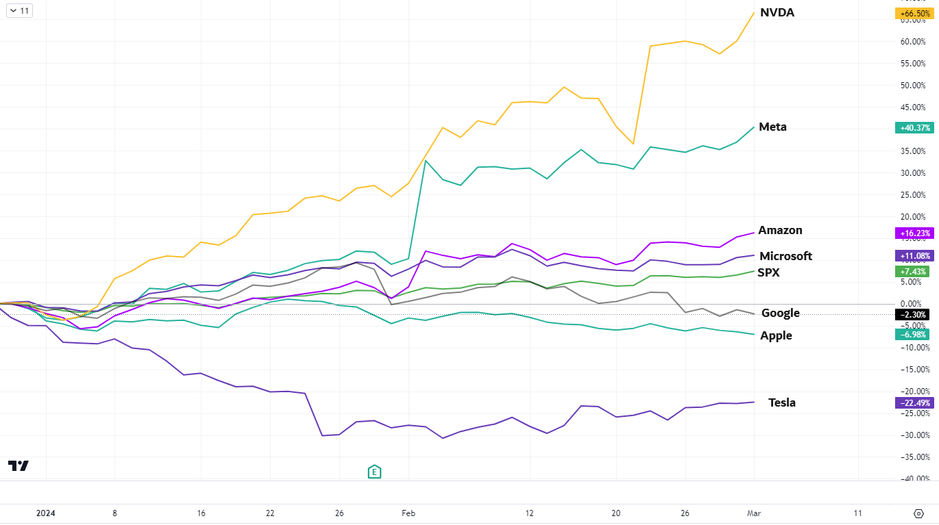 However, there are emerging signs of exhaustion in the trend, and market breadth appears stretched, even among the usual market leaders. Notably, Tesla peaked in July 2023, followed by Apple and Google in February, and now Microsoft fails to reach new highs despite the recent market upsurge. What was once the "Magnificent 7" of 2023 has now dwindled to the "Magnificent 3" of 2024: Nvidia, Amazon, and Meta.