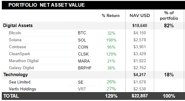 Coming to portfolio positions. Positions continue to perform well. We started the portfolio with $10,000 on October 20th 2023, and we are up 129% since.