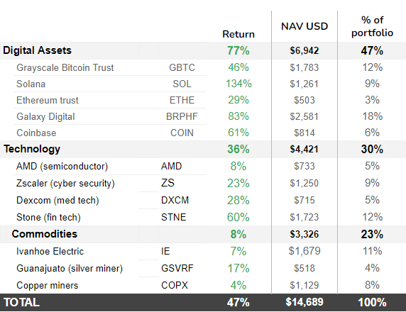 We started the portfolio with $10,000 6 weeks ago, and the net asset value is up 47%!